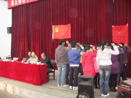 大会在雄壮的国际歌中开幕,李红忠老师宣读了参加宣誓的预备党员名单,之后,新发展的12位党员悉数上台,面对党旗,庄严宣誓,正式成为中国共产党光荣一员。会上,老党员代表申显伟、新党员代表雍艳、入党积极分子代表虎啸,根据自身情况及认识,分表作了发言。该系党总支副书记贾永发表重要讲话,他勉励新加入的党员,一定要牢记党的宗旨,严守党的纪律,服从党的决定,执行党员义务,加入中国共产党是一个人政治生命的开始,从宣誓那一刻起在心中树立起党员意识,时刻以党员标准严格要求自己,以自己优秀的行为影响身边之人,身先士卒,乐于奉献,做到让群众、让组织、让师生满意。