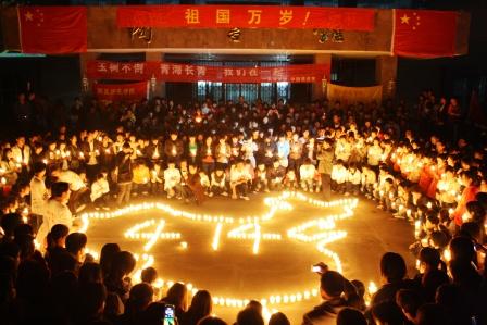 晚七点,夜幕降临,在一段抗震救灾的视频过后,祈福活动正式开始,同学们用点燃的蜡烛围成了祖国的形状,“4.14”醒目的摆在正中央,同学们手持蜡烛在围成心形,在烛光下为玉树地震遇难者同胞默哀祈福。之后,在该系领导的带领下,现场每个人都依次走到捐款箱前,奉献出自己的一片爱心。玉树不倒!祖国万岁!,在这振奋人心的高呼声中,活动走向尾声。
