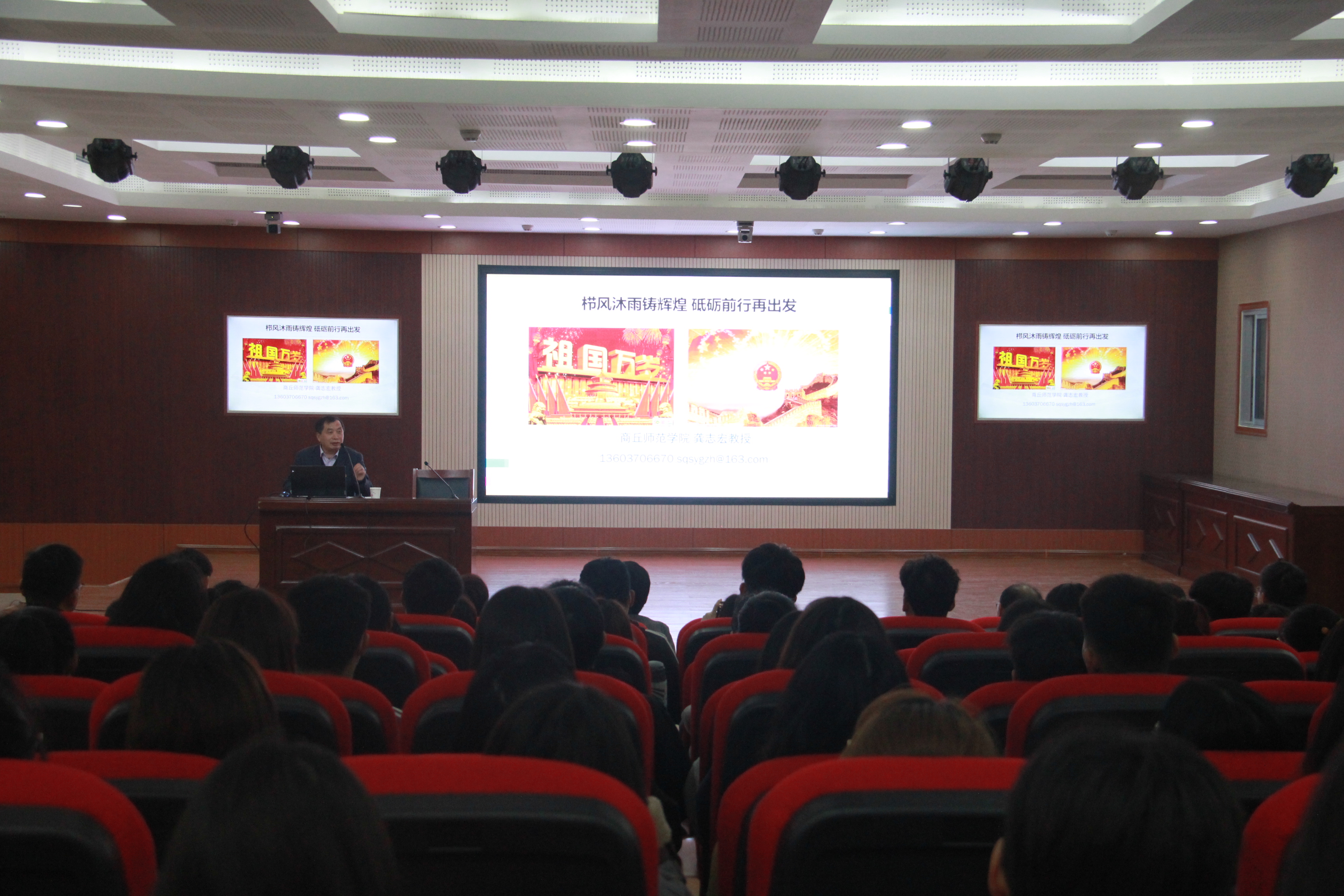 龚志宏教授以《栉风沐雨铸辉煌 砥砺前行再出发》为题作专题报告。龚教授围绕栉风沐雨七十余载、春华秋实铸就辉煌、砥砺前行再谱新篇三个方面,内容详实、深入浅出地讲述了建国后中国共产党带领人民团结奋进七十余载所取得的辉煌历史和伟大成就。他系统展示了中华民族在实现伟大复兴道路上取得的辉煌成就和中国特色社会主义道路的实践成果,详细解读了“两个一百年”奋斗目标和“十四五”规划,带领大家展望了未来中国发展的美好图景。他强调,要正确认识党的重要历史时期和重要思想,以科学、客观的态度学习党的历史。