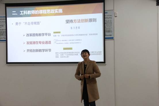 寇小希结合自己对课程思政建设的研究与实践,从工科课程思政的必要性、工科教师的课程思政实施、探寻育人元素及寻找切入点三方面进行了深入浅出、生动形象的讲解。寇小希分享了自己的教学案例,探讨工科课程思政的教学理解和教学方法,重点讲解课程思政建设中知识优先、方法创新、系统设计、持久改进四项实施原则,并就如何加强教学改革和教学反思,使思政元素如盐化水、润物无声地融入全课程体系提出了独到的见解。最后,寇小希与老师们围绕课程思政教学实施方法、评价体系以及考核方法等话题展开深度讨论。