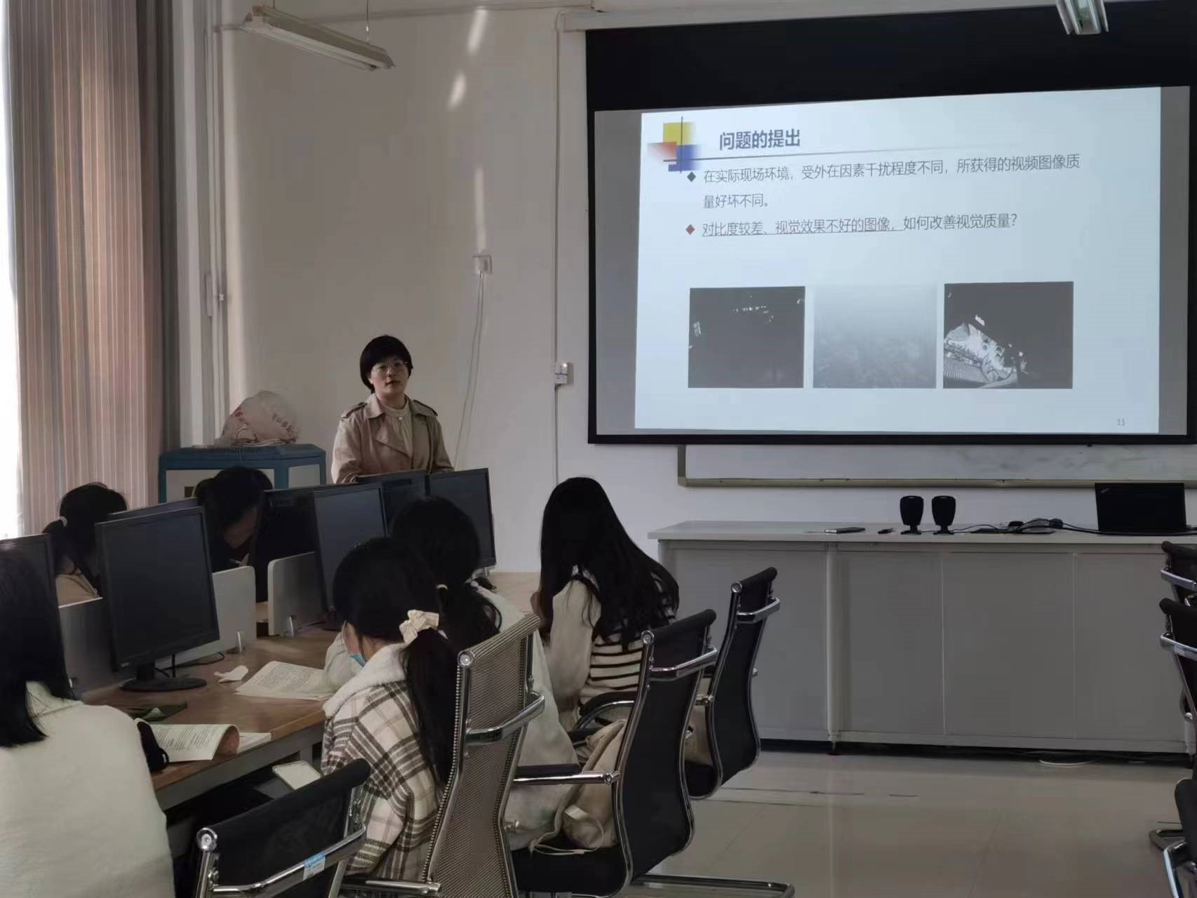 课程开始,邢会敏老师给出问题“为什么要进行图像增强?”,并引导员工思考:“图像是人类获取信息的重要手段,是感知外部世界的两大途径之一,但是,在获取图像的过程中可能存在外部因素使图像质量下降,或者我们只对图像中的某些特定特征感兴趣,如何抑制不感兴趣的特征,改善图像质量、丰富信息量,加强图像判读和识别效果?”。之后,通过让员工观看一些有特殊效果的图像,激发员工兴趣和求知欲,解答问题。接着通过案例分析,让员工思考并总结图像增强的算法,最后,通过编程实现图像效果增强。