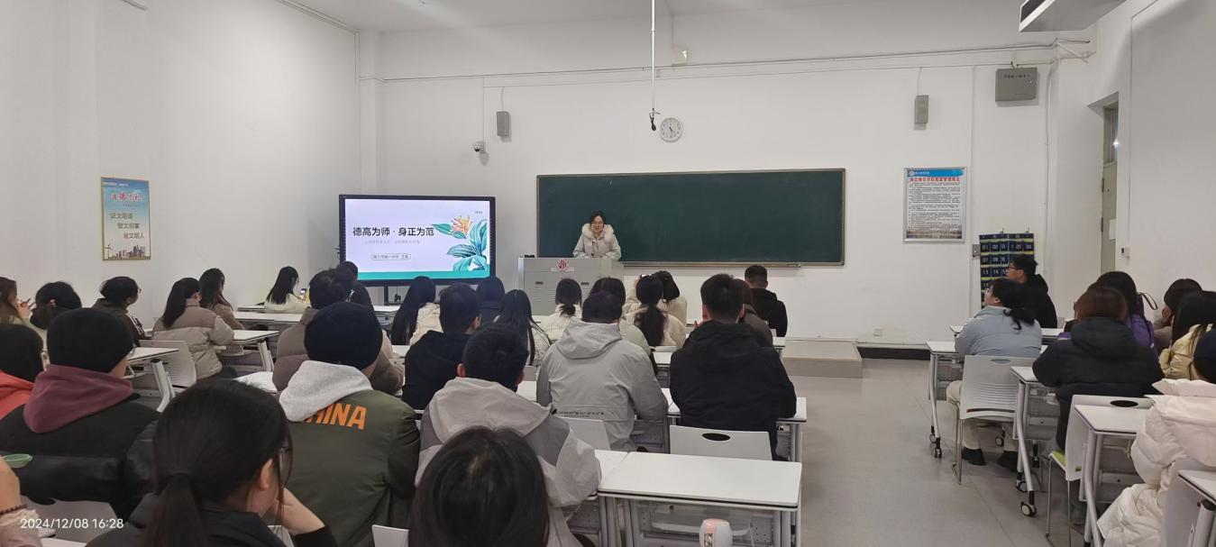 讲座伊始,王冕老师首先强调了教师职业的特殊性和重要性。她指出,教师是人类灵魂的工程师,肩负着立德树人的神圣使命,教师的师德师风直接影响着员工的成长成才,关系着国家和民族的未来。接着,王冕老师详细阐述了“四有好老师”的标准。她结合自身经历,分享了如何在教育实践中坚守教育理想,鼓励未来的教师们要将个人理想与国家发展、民族复兴紧密结合;随后,她列举了教育实践中的具体案例,阐述了如何处理师生关系、同事关系以及与家长之间的关系;与此同时,她强调,一名合格的教师必须具备扎实的专业知识和广博的文化素养,不断学习,更新知识,努力成为员工的学习榜样。