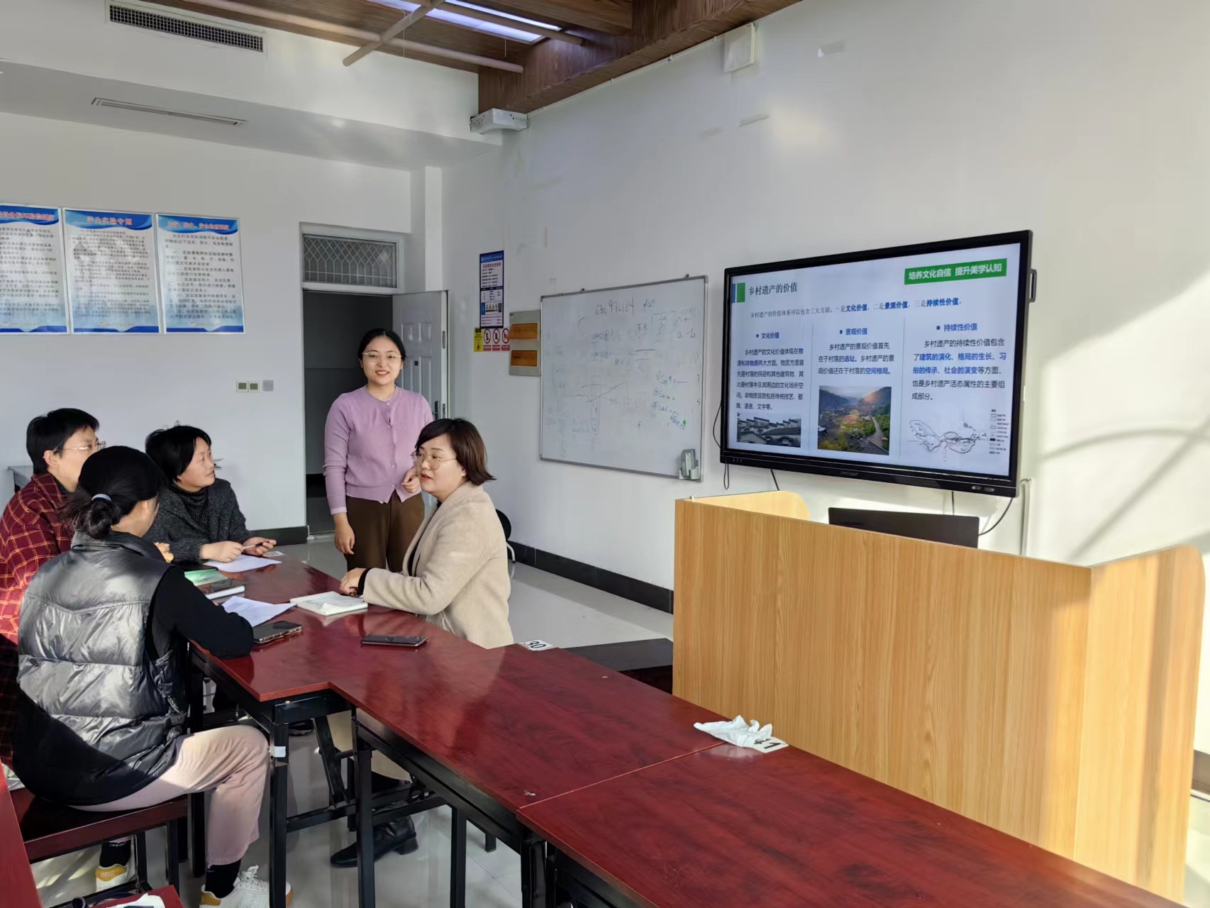 首先,张平老师以《乡村规划与设计》课程中的乡村遗产保护这一章节为例给大家分享了她在教学中如何开展课程思政的教学融入,以培养员工的文化自信、美学认知以及大国工匠精神。